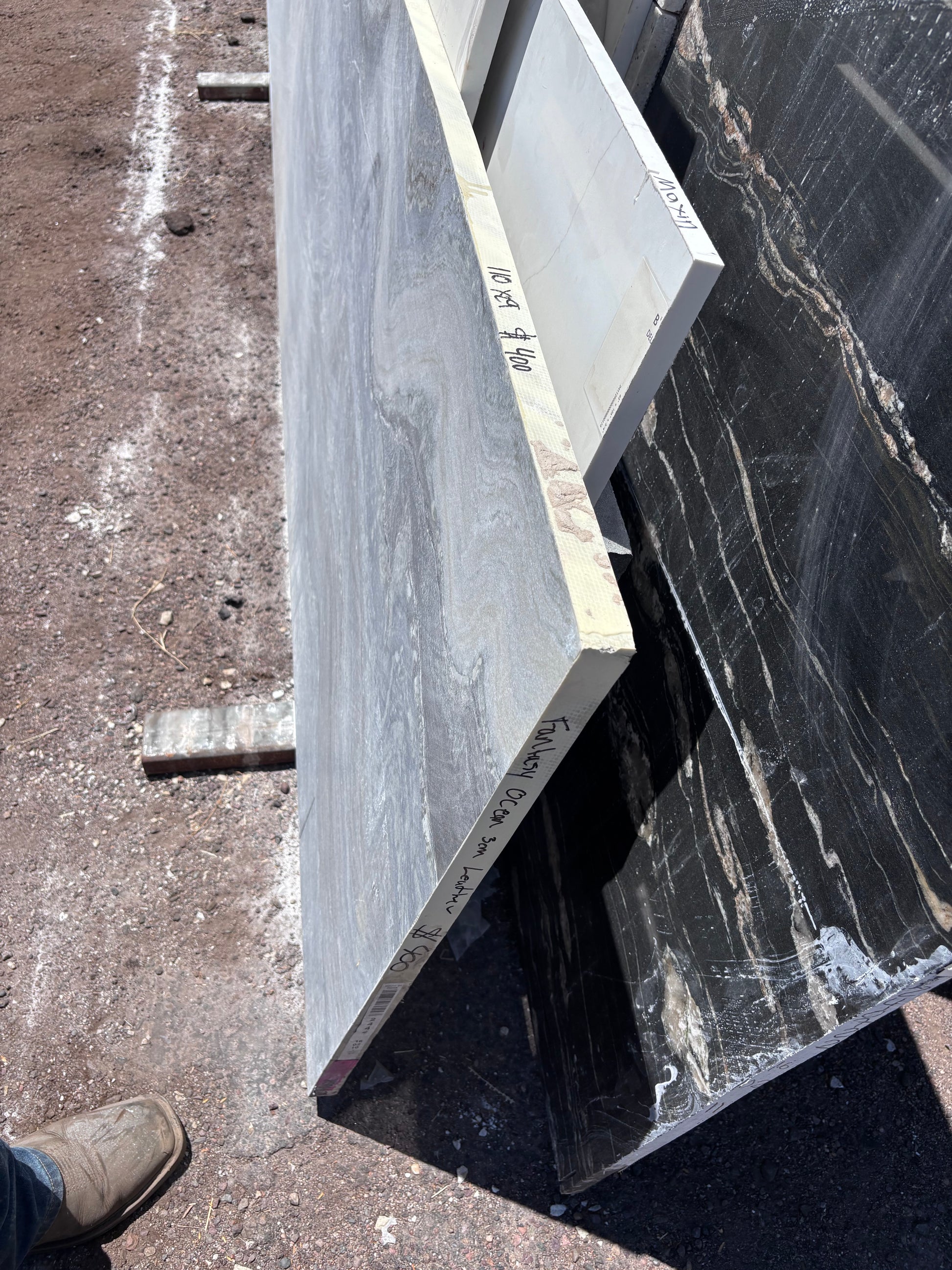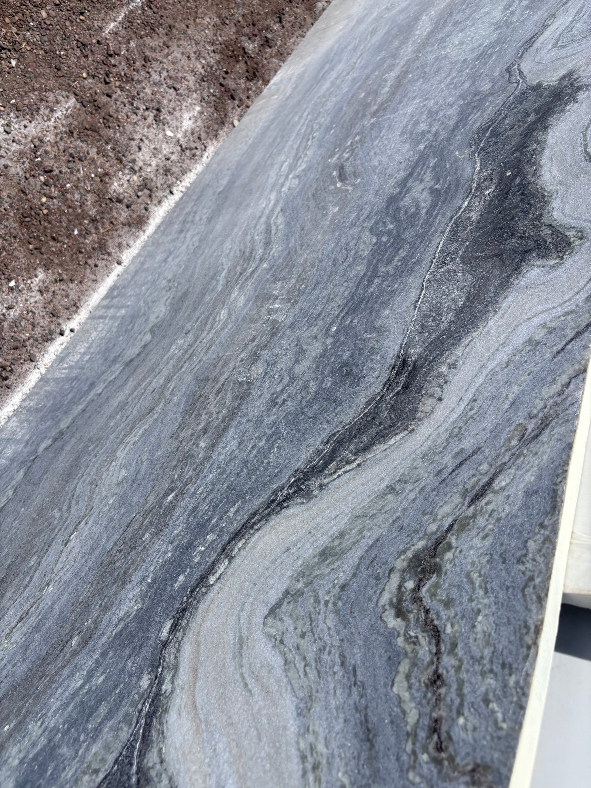 This stone has horizontal linear movement that is blue, grey, and white in color. Random thick, black veins show up throughout this stone, creating a dramatic look.