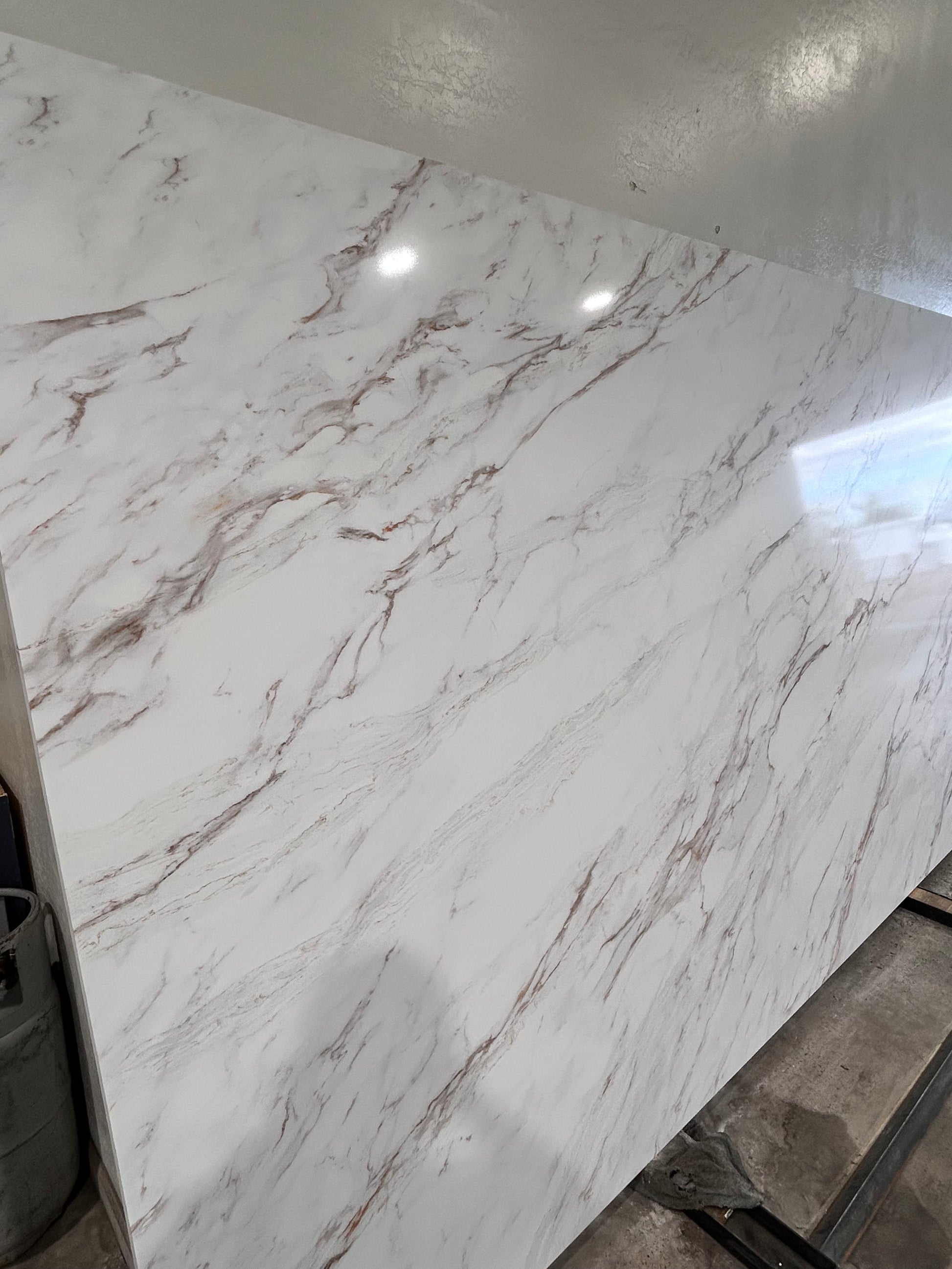 This elegant white slab features a soft ivory base accented by flowing, natural veining in warm taupe and subtle gold undertones. The pattern moves gently across the surface, creating depth and visual interest without overpowering the space. Delicate clouding and smooth transitions give the material a refined, organic look that feels both modern and timeless.