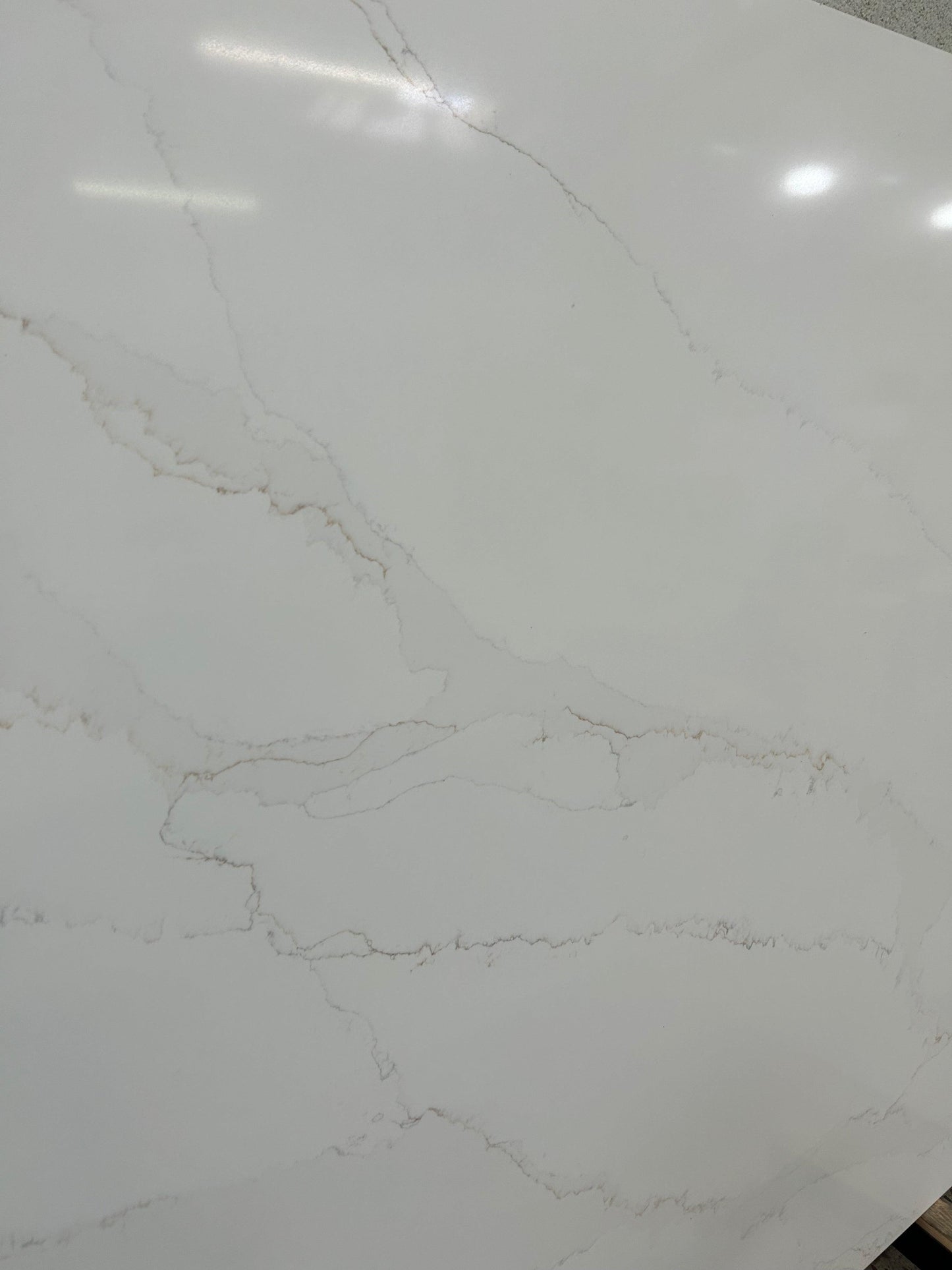 Glossy white quartz slab with thin and light brown veins. This will give your kitchen an exotic look. Visit our warehouse today!