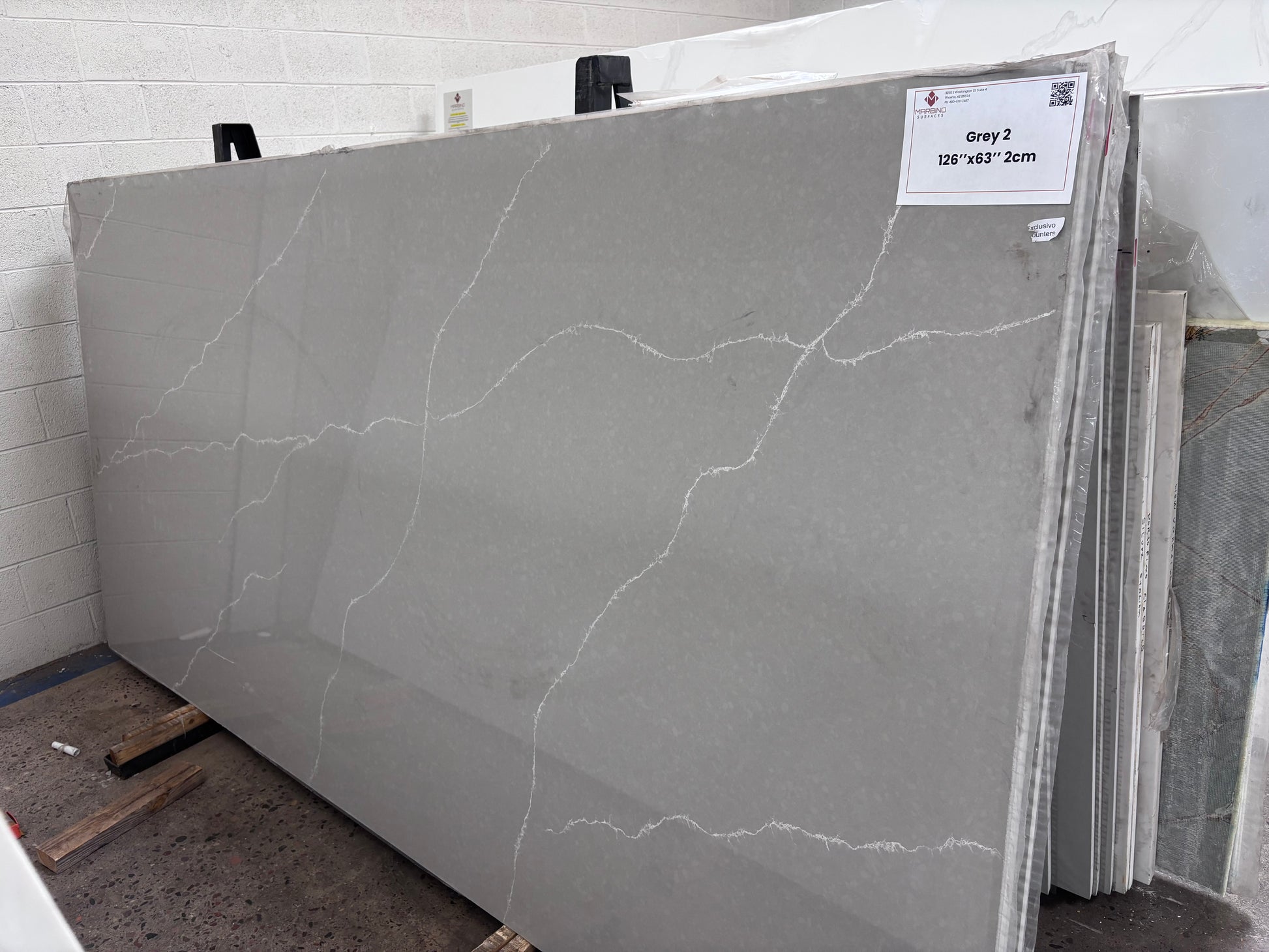 The Sale for this month is “Grey 2”. This slab offers a medium gray background with thin white vein running through it. Resembles a natural soapstone, but with a high gloss finsih and the durability of a quartz material. (LIMITED INVENTORY)