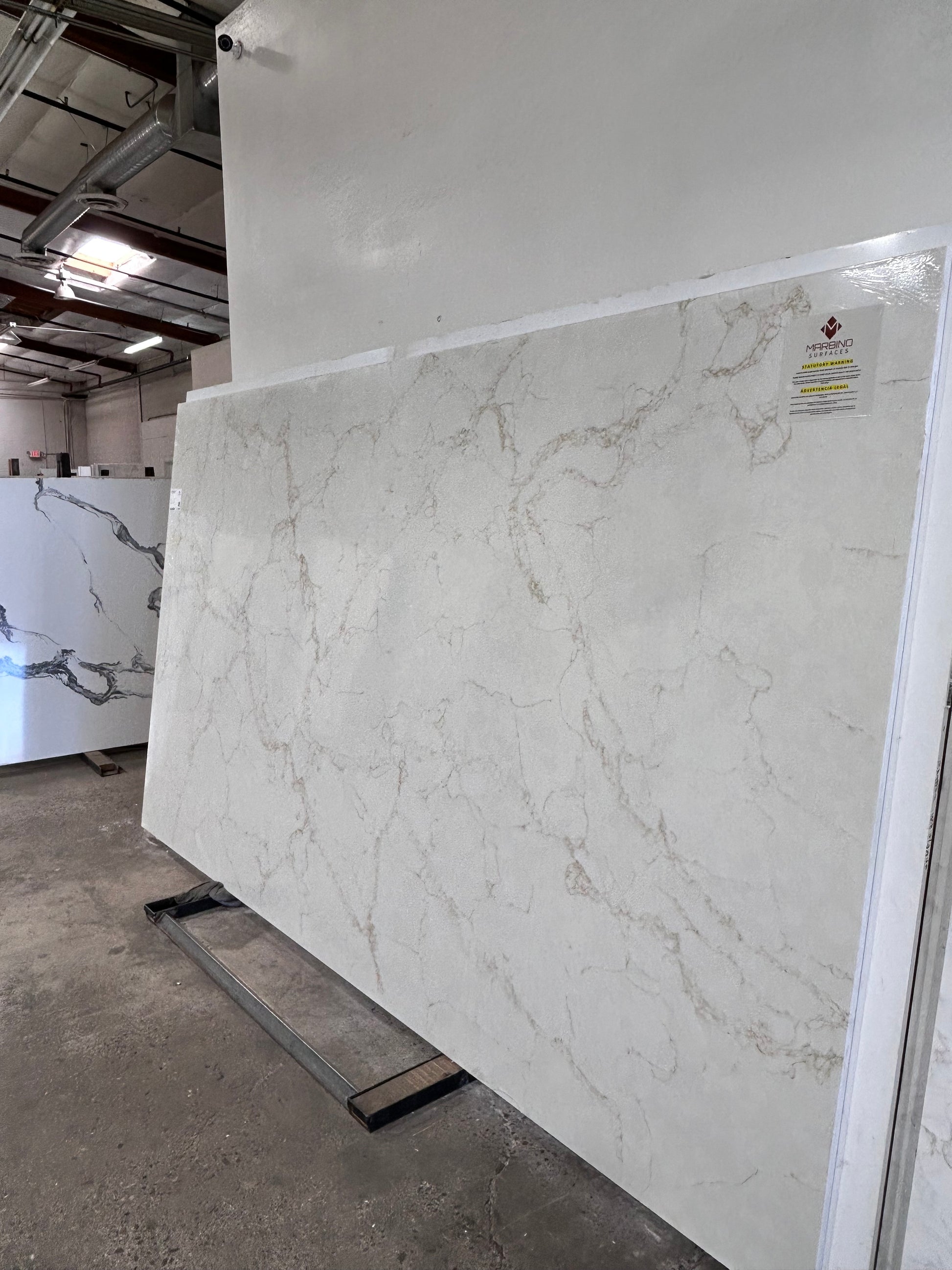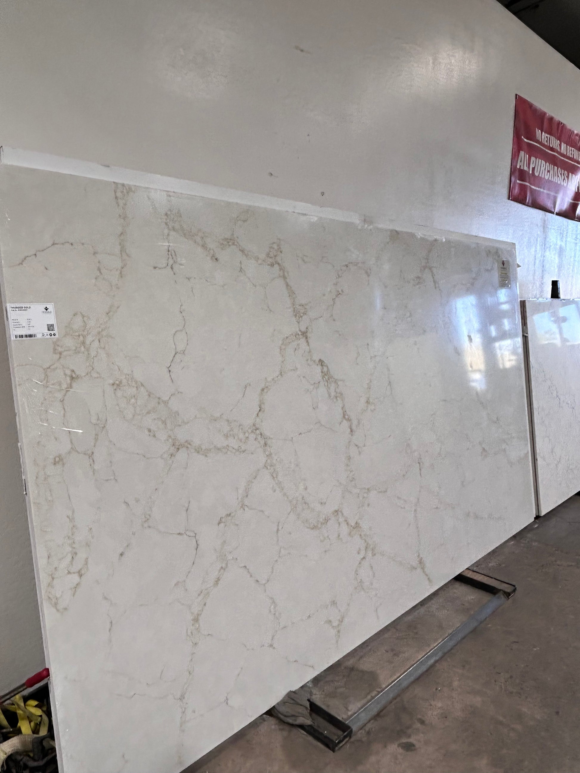 Thunder Gold quartz features a bright white background accented with elegant gold and soft gray veining that adds warmth and movement to the surface. Its durable, non-porous quartz construction makes it perfect for kitchen countertops, bathroom vanities, and other high-use areas while maintaining a clean, modern look.