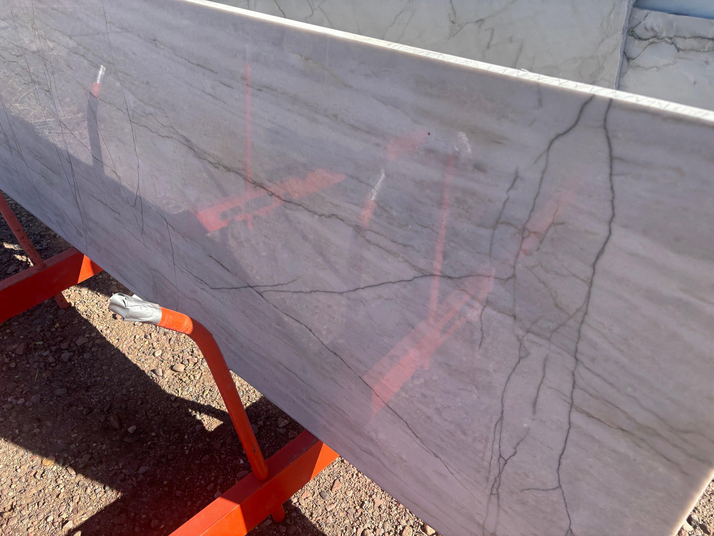 White Macaubas is a Brazilian Quartzite with the White and top background, deep, random charcoal veins running through it.